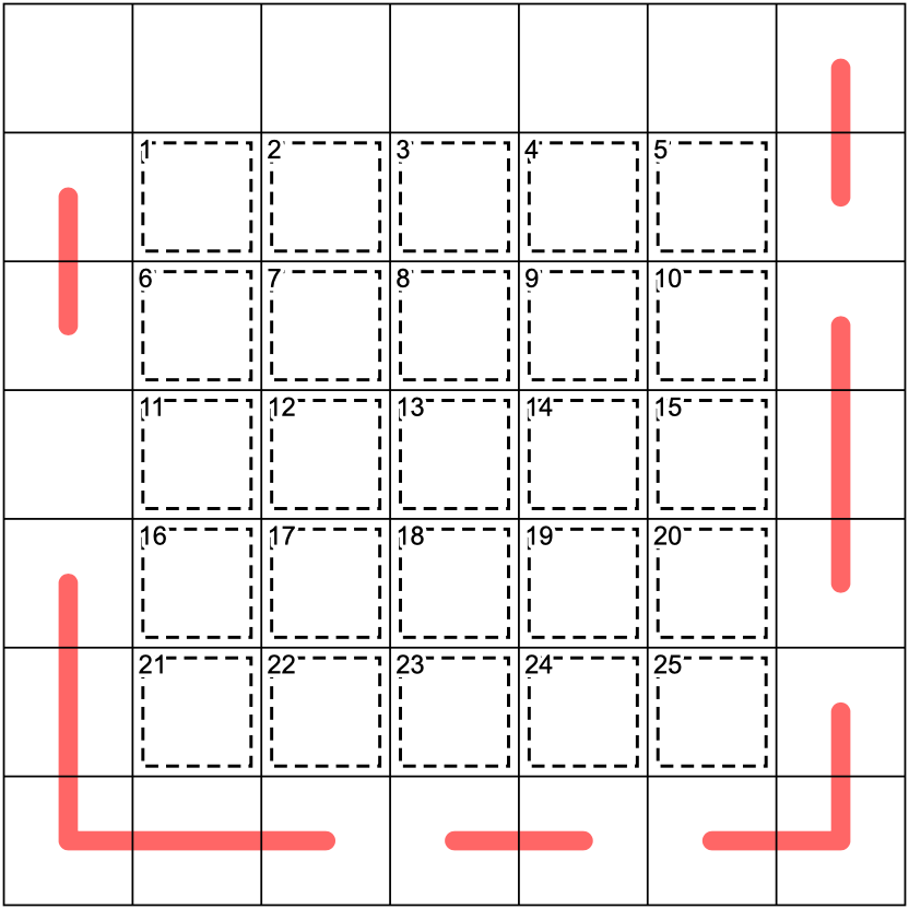 Adjacent digits on a red line have opposite parity (one is odd, one is even).