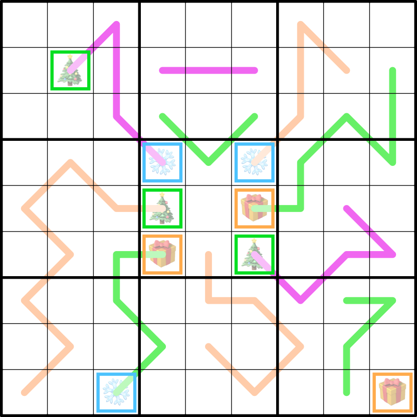 Festive hints: Cells marked with Snowflake (blue square) must contain low digits (1,2,3). Cells marked with Gift (orange square) must contain middle digits (4,5,6). Cells marked with Christmas tree (green square) must contain high digits (7,8,9).