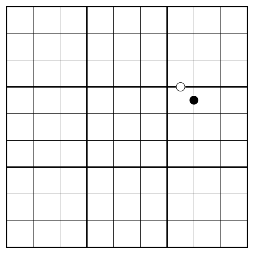If you like a challenge, you can try a harder version with only a single white dot (same solution)