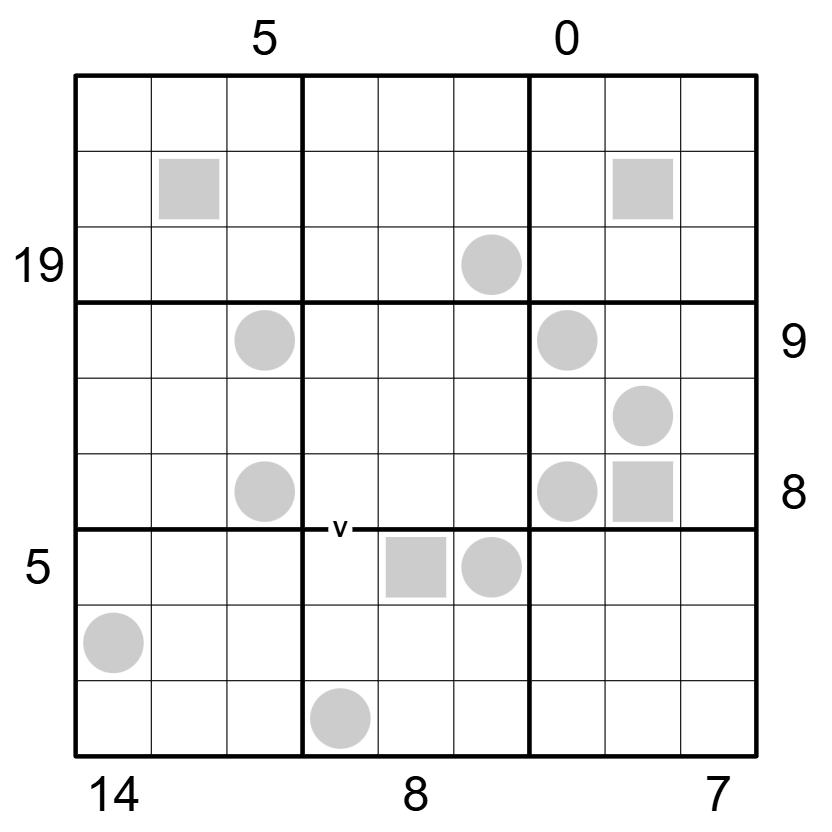 Sandwich: A clue outside the grid gives the sum of the digits appearing between the 1 and the 9 in that row/column.