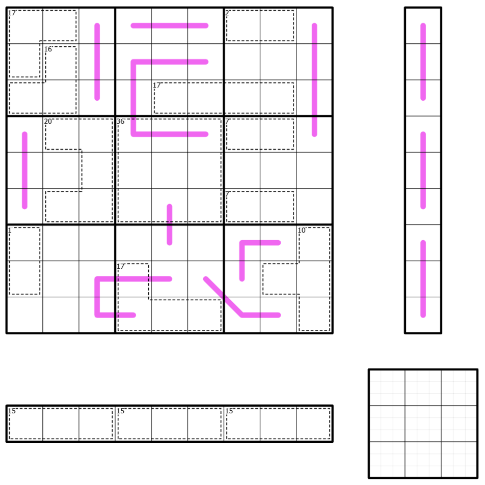 Renban: Digits along a pink line form a non-repeating set of consecutive numbers.
