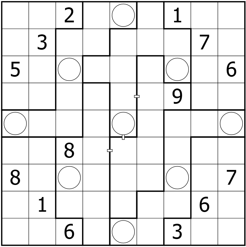 • Place the digits 1-9 once in every row, column, and region.