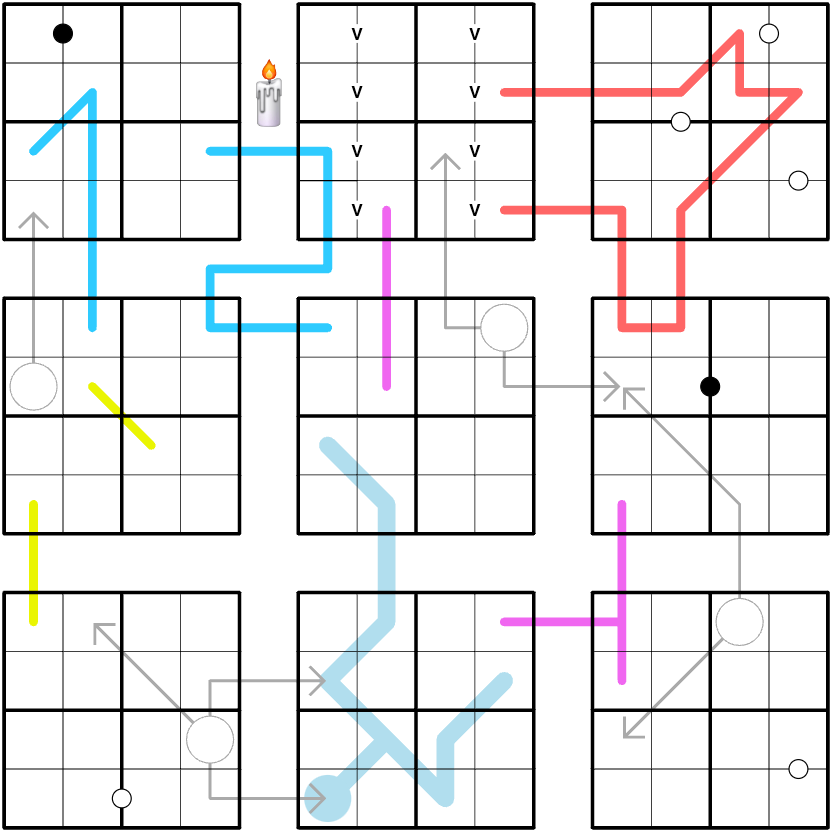 • Normal 4×4 Sudoku rules apply in each of the nine 4×4 grids.