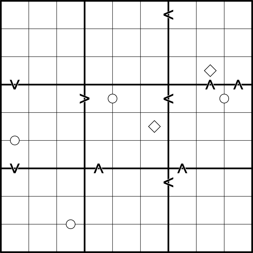 • Inequality signs point towards the lower of the two digits. White kropki dots join two consecutive digits. Not all dots may be given.