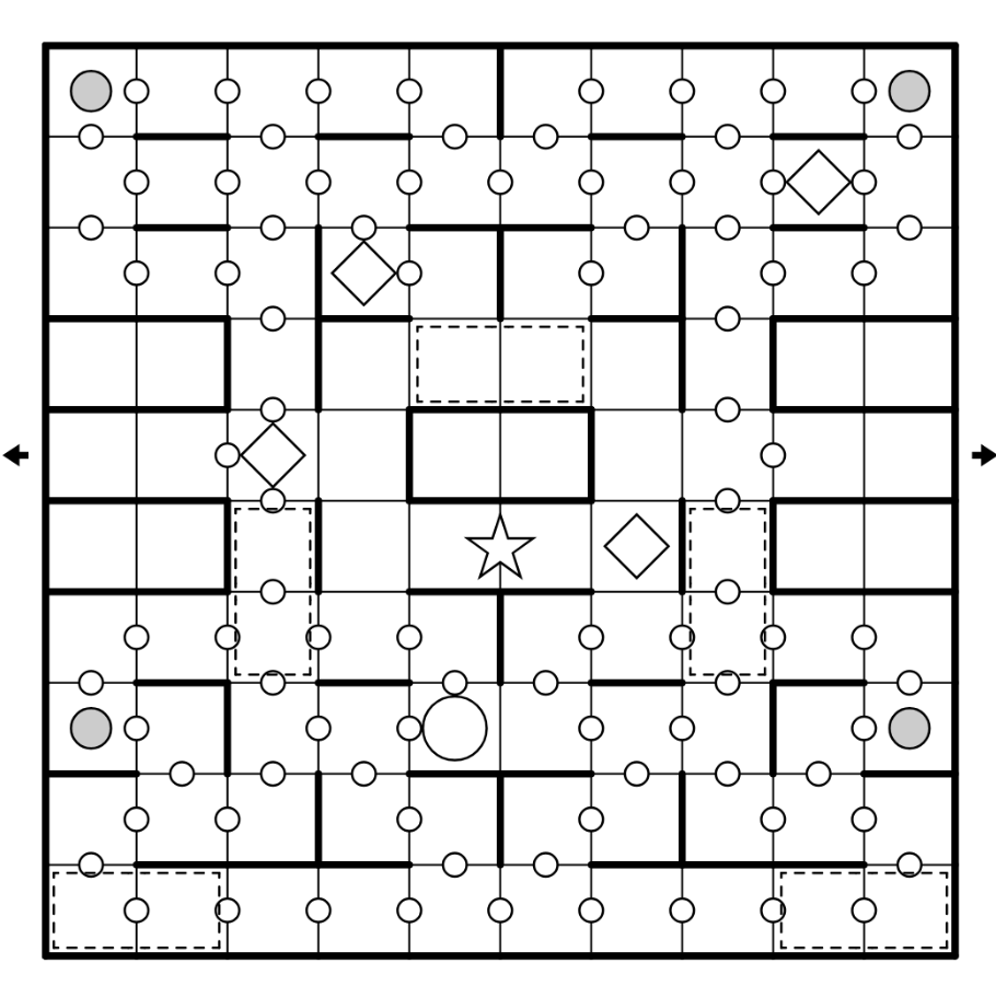 4. Pac-Man must land exactly on a grey dot to gain power. When powered, Pac-Man may kill one ghost (white lozenge) by landing exactly on it. Pac-Man cannot pass through a ghost without killing it.