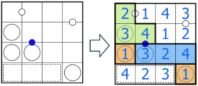 Create regions consisting of orthogonally connected cells. Each region contains exactly one circle and every circle belongs to a region. The number inside the circle indicates the size of its region. No digit may repeat within a region, and the sum of all digits within a region must be a square number (1, 4, 9, 16, etc.). Not all cells are required to belong to a region.
