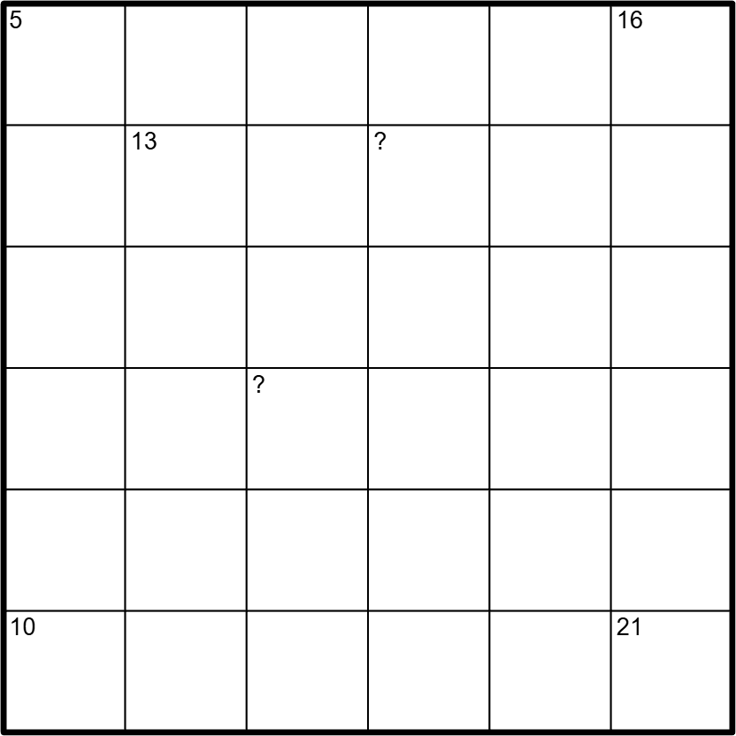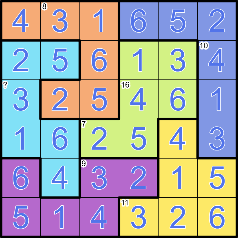 The grid has to be divided into six regions of orthogonally connected cells. Each row, column and region has to contain the digits 1-6 once each.