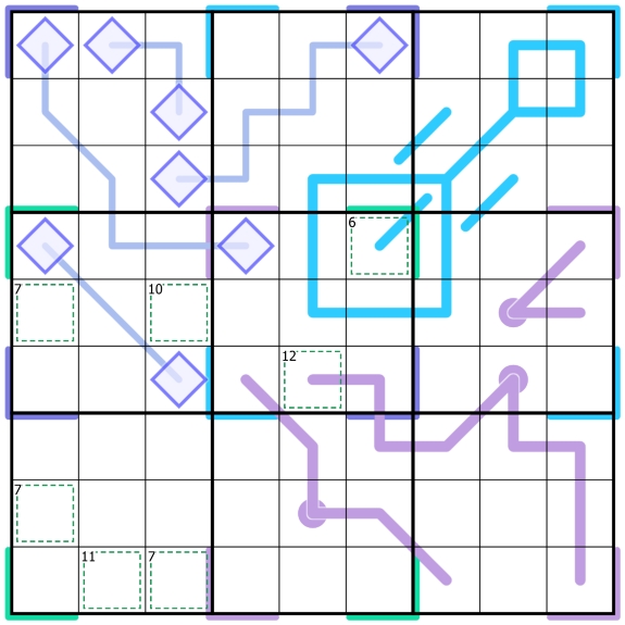 — The 3x3 box borders divide the sky blue lines into segments of the same sums.