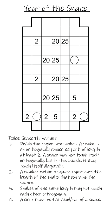 This is one of 12 disjoint puzzles I made this year with varying styles/difficulties themed around snakes and 2025.