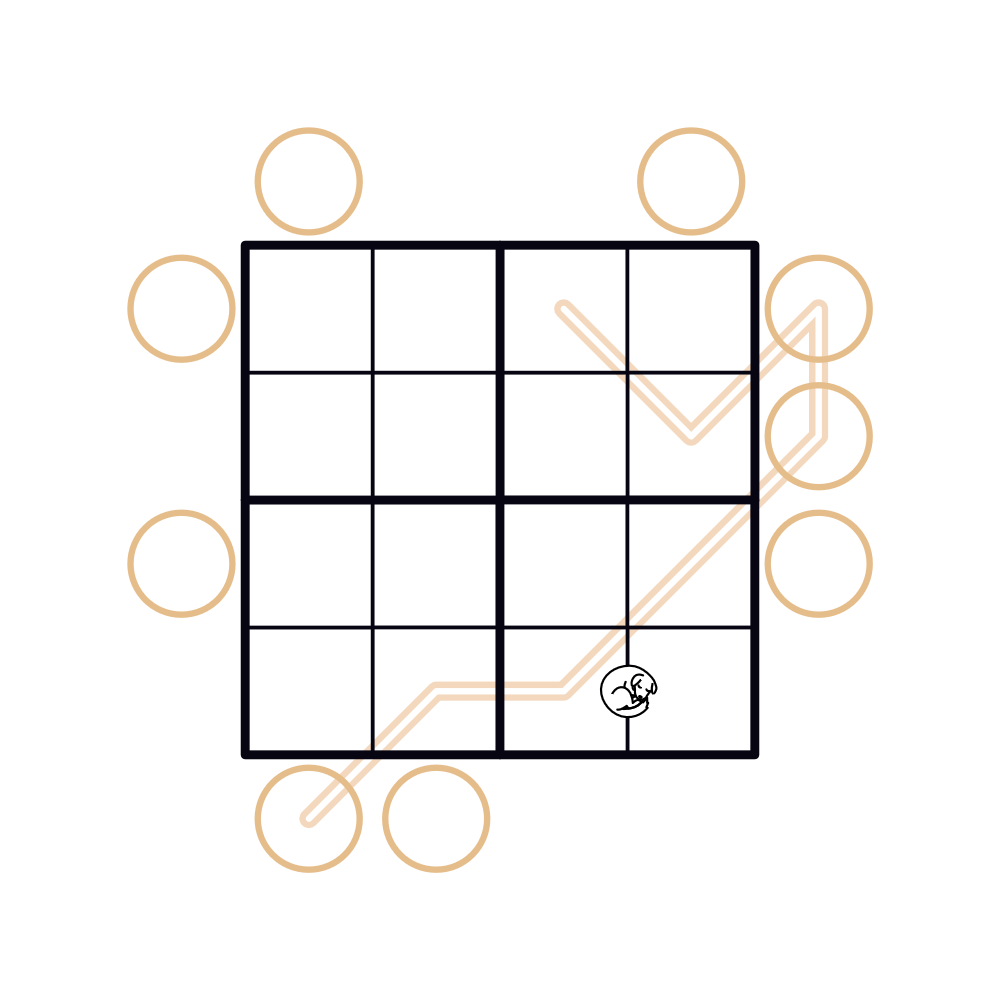 - A circle outside the grid has a value equal to the sum of the digits on the first X cells in the corresponding row/column, where X is the digit of the cell nearest to the clue. No two circles may have the same value.
