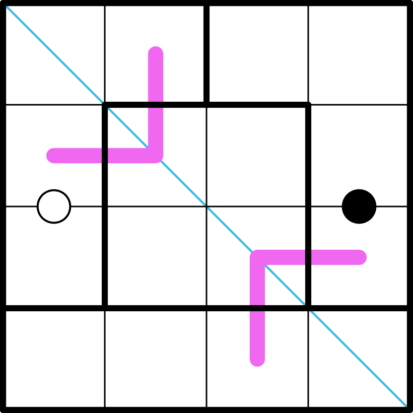 Irregular 4x4 Sudoku: Place the digits 1-4 exactly once in every row, column, bold-outlined region, and marked diagonal.