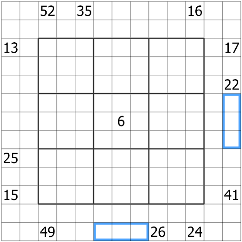 Spaces directly outside the grid should be filled with 'Numbered Rooms' clues. A 'Numbered Rooms' clue X indicates that the digit X is N steps away from the clue, where N is the first digit seen inside the grid.