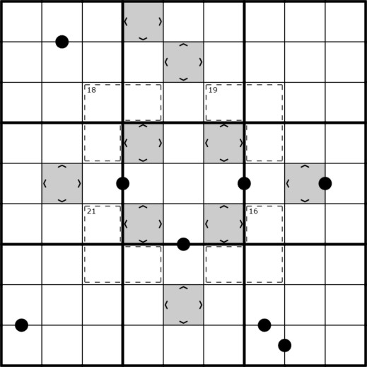 MAXIMUMS- Gray cells with a greater than symbol are greater than all orthogonal neighbors. None of the maximums are the number 9.