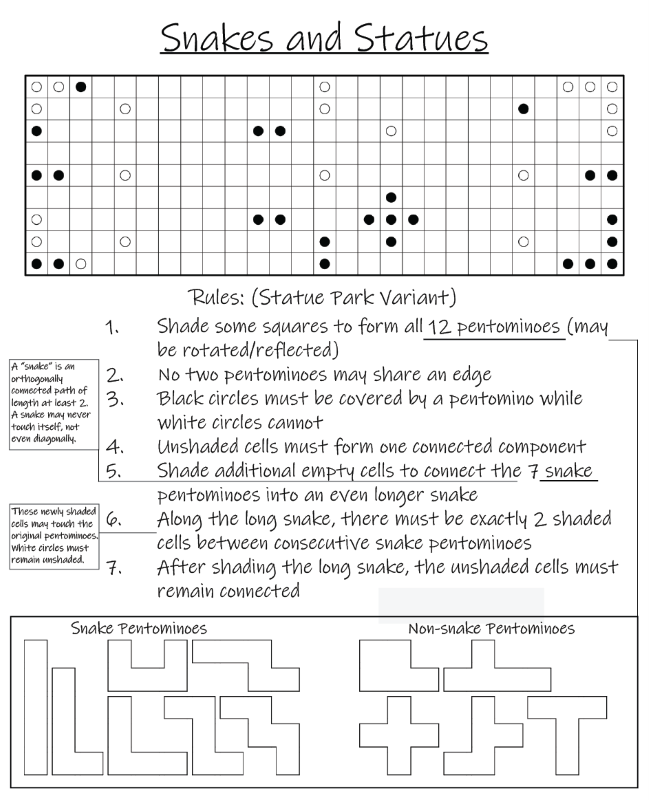 5. Shade additional empty cells to connect the 7 snake pentominoes into an even longer snake. A “snake” is an orthogonally connected path of length at least 2. A snake may never touch itself, not even diagonally.