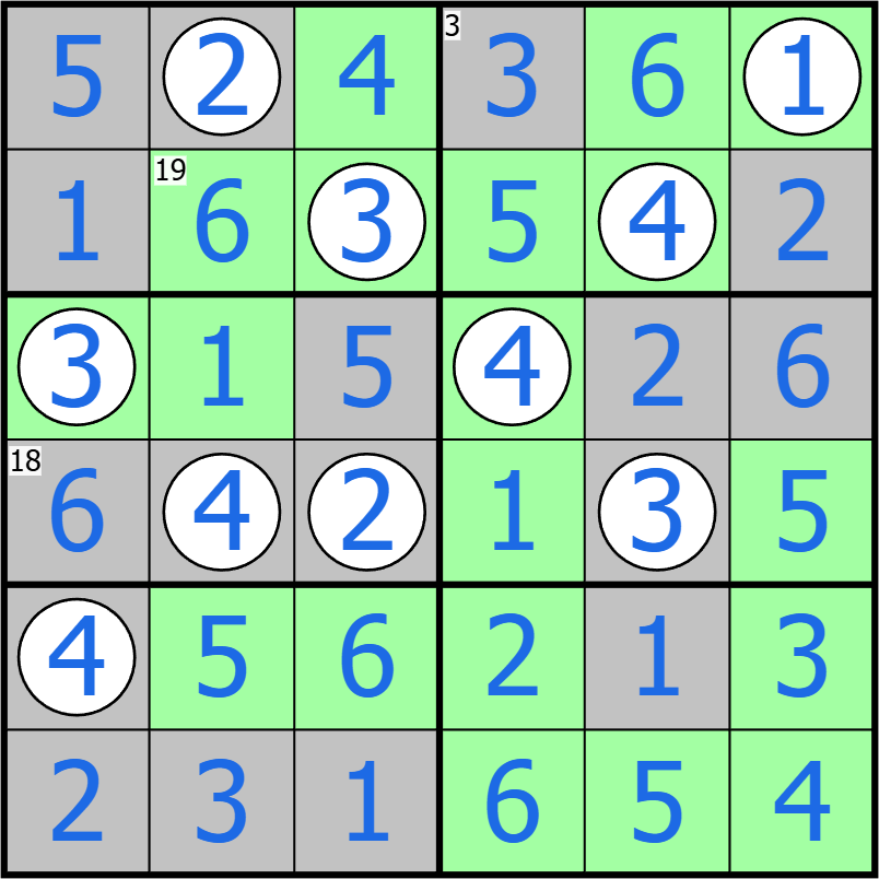 For example, here is a solved 6x6 puzzle with the same ruleset