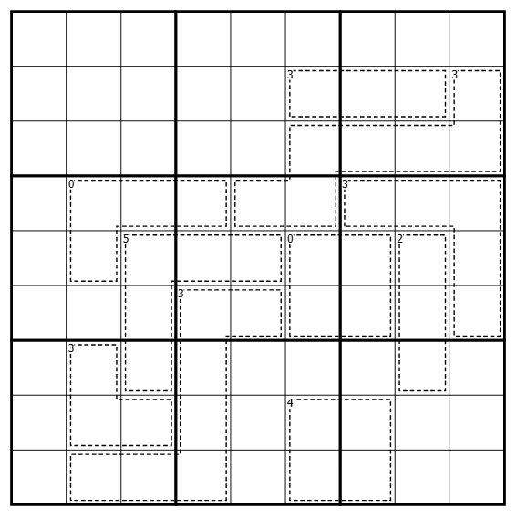 • The number in a cage's top-left corner shows how many Fibonacci digits {1, 2, 3, 5, 8} it contains.
