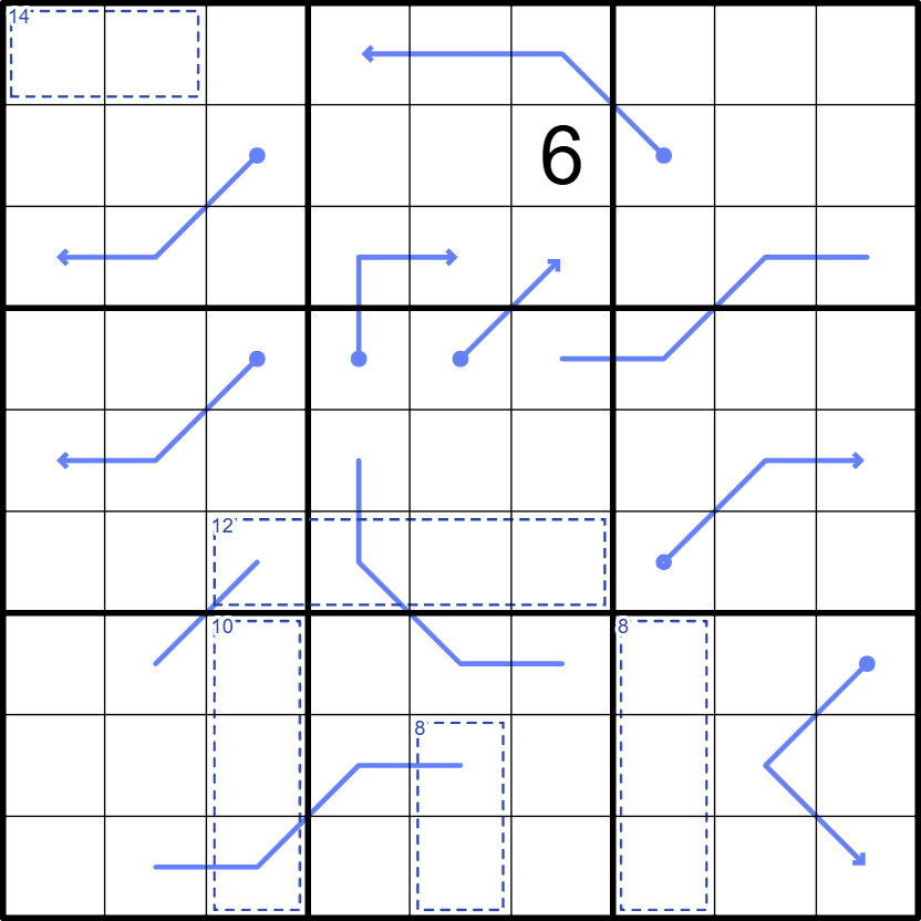 Normal sudoku rules apply: Place the digits 1-9 into every row, column and 3x3 box. Killer: Digits in cages do not repeat and sum to the number in the top-left corner. Arrows: Digits along an arrow sum to the number in the bulb. Palindromes: digits along a line (with no bulb/arrows) read the same sequence forwards and backwards.