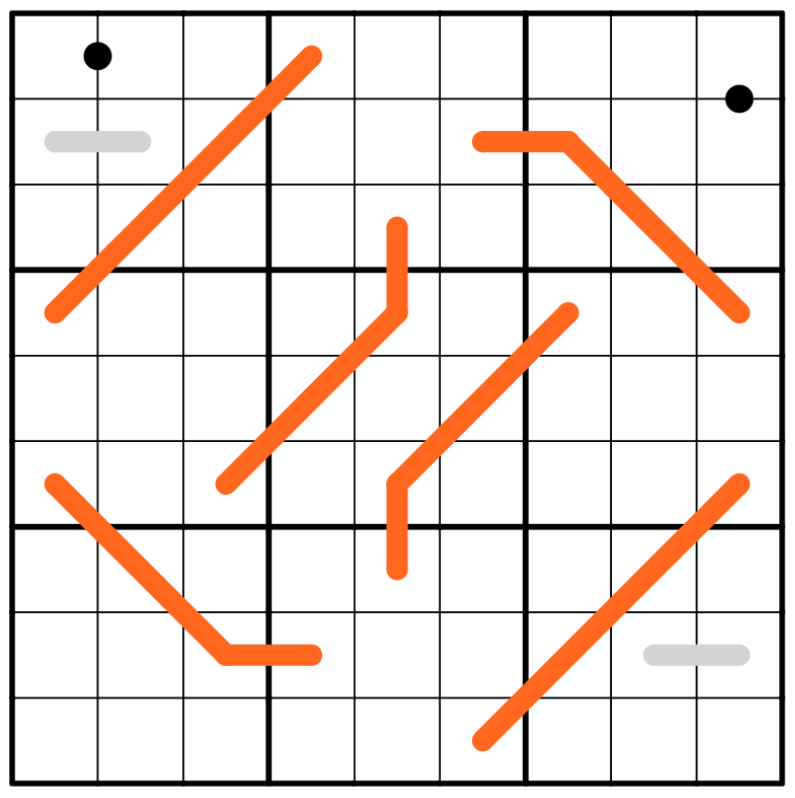 Normal sudoku rules apply. Adjacent digits on a saffron line must have a difference of at least 3. Additionally, digits two cell apart on a saffron line must have a difference of at least 5. For e.g. a 4 cell long saffron line filled “ABCD”, A and B, B and C, C and D will have a difference of at least 3 and the A and C, B and D will have a difference of at least 5. Grey lines are ten sum lines. Digits on each grey line sum to ten. Two digits on a black dot means one digit is double the other.