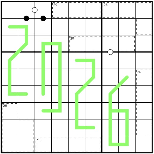 Kropki: Cells linked with a white dot are consecutive. Cells linked with a black dot have a ratio of 1:2. Not all possible dots are given.