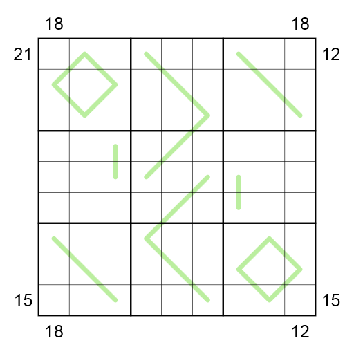 - Normal sudoku rules apply, i.e. each row, column, and 3x3 region has to contain the digits from 1 to 9 once each.