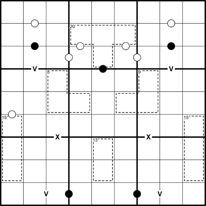• Digits in cells separated by a "V" must sum to 5, digits in cells separated by an "X" must sum to ten - not all X's and V's are shown