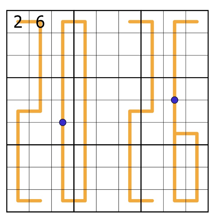 The two digits separated by a blue dot are 2 and 6 in some order (not all dots are necessarily given).