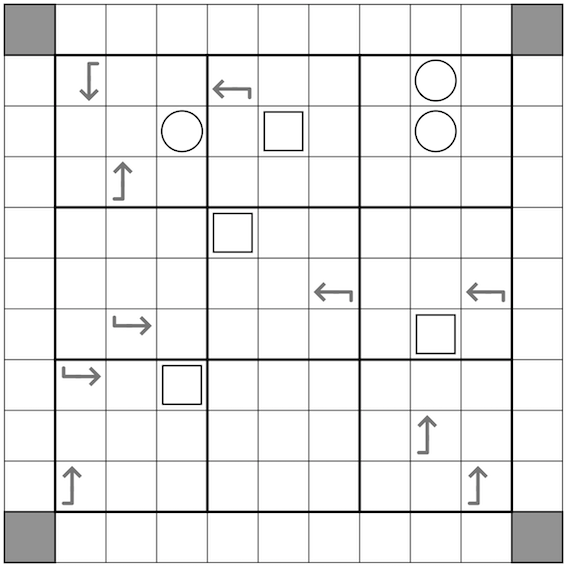 Arrow cells containing an odd digit sit at the bend of an L-shaped region and indicate the size of its region.