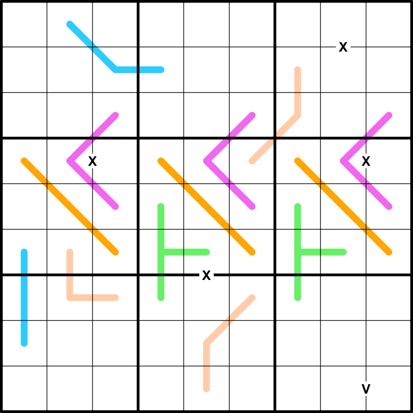 • V-Sums: Digits separated by a V sum to 5. (X and V sums are considered separate constraint types for Uniqueness)