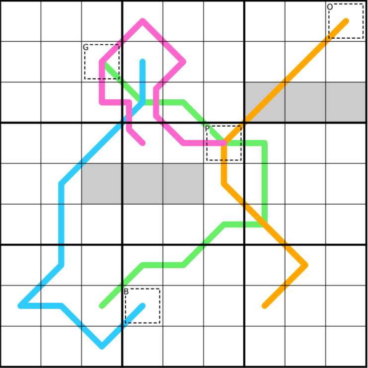 There are four cryptic crossword answers in the grid, one on each colored line (O, G, P, and B).