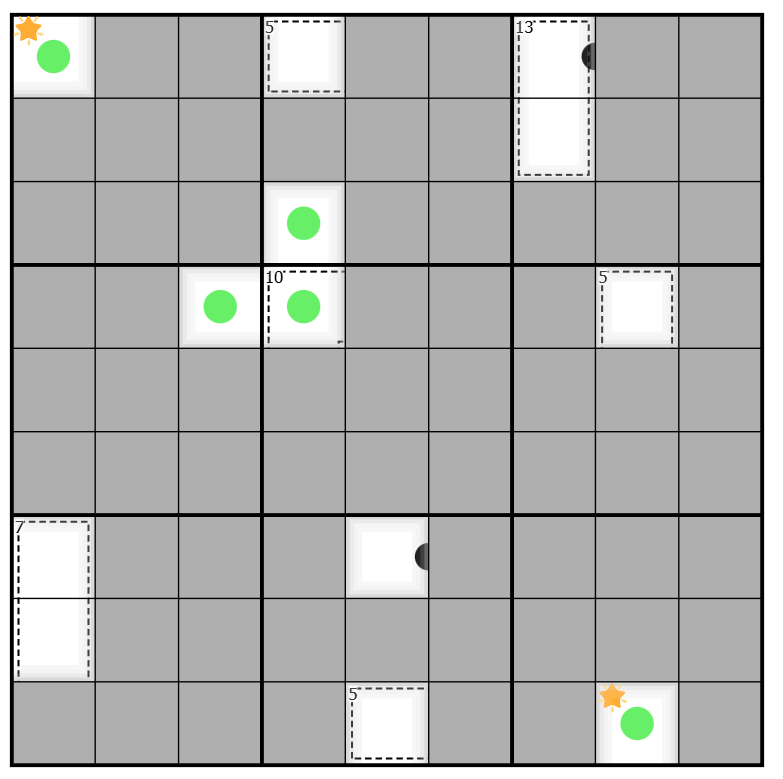 - Whisper Path: Draw a path through the grid which starts and ends with the cells with stars (R1C1 and R9C8). The path acts as a German whisper line, in which adjacent digits must have a difference of at least 5. Cells with green circles are given as part of the path. The path may only move orthogonally and can not touch itself, even diagonally.