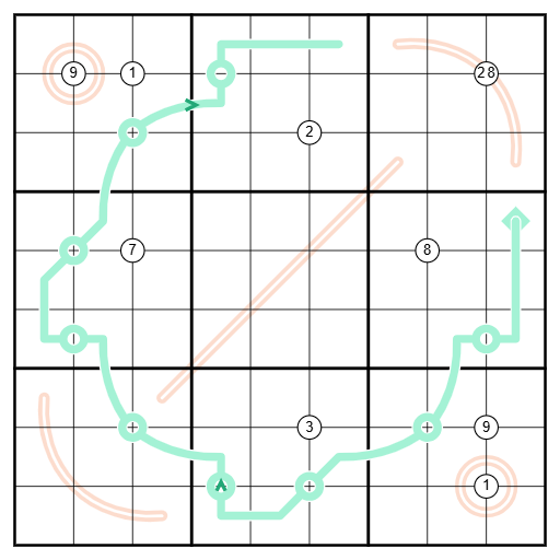 Equal Sum Line: Teal lines are also Equal Sum Lines. Circles along the line divide it into segments. The digits in each segment sum to the same value.
