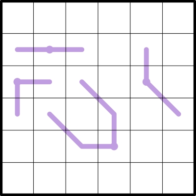 — In the bottom (or right) grid, for each line, cells that are the same distance from the (dotted) center of the line must belong to the same region, cells at different distances must belong to different regions, and the center must be in a distinct region by itself.
