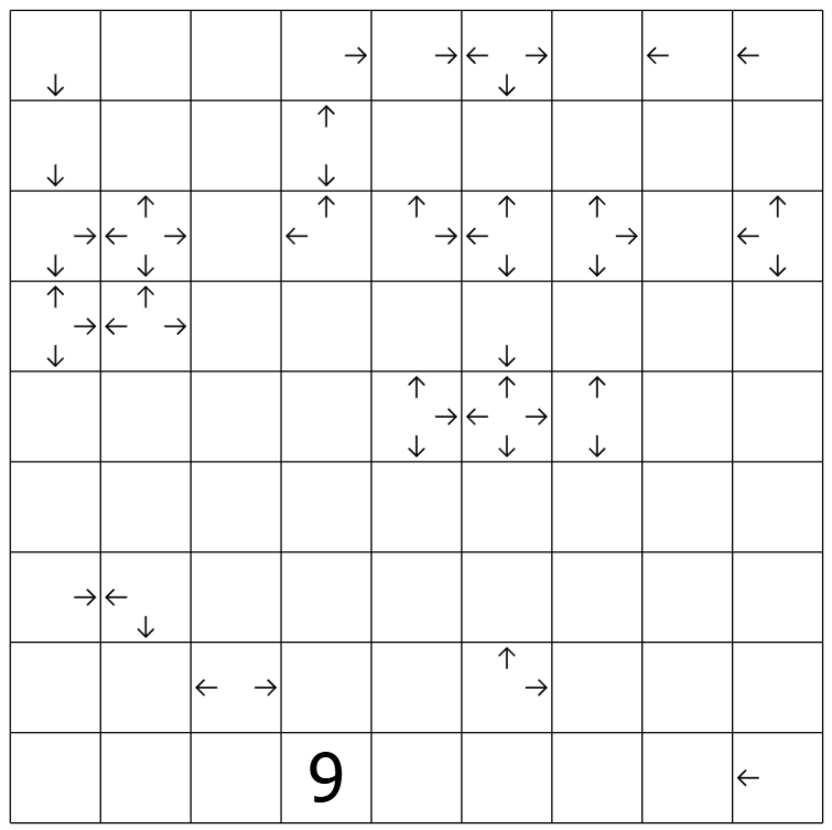If a cell contains multiple arrows, the cell's digit is the total number of 'region clues' seen in all indicated directions.