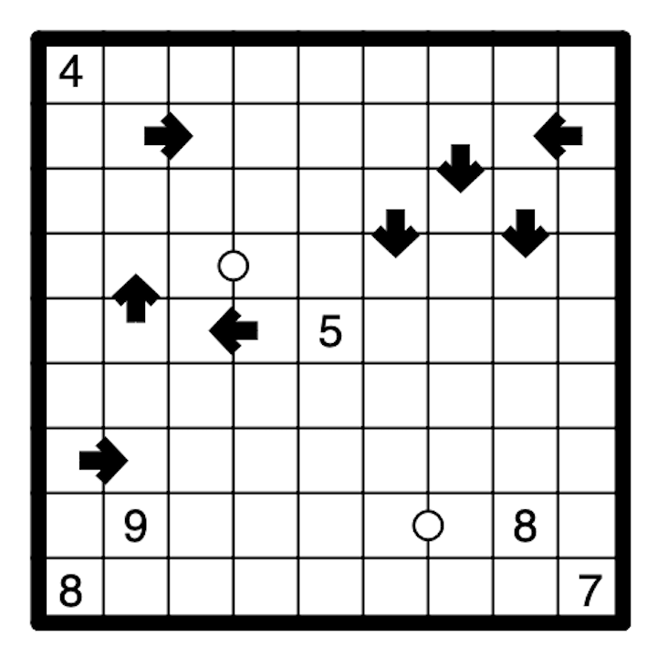 Both cells that an arrow touches belong to the same region, and the cell directly in front of an arrow is not in that region. The number on the tail of an arrow indicates how many cells (in the indicated direction) in different regions must be travelled across until another cell belonging to the same region is reached.