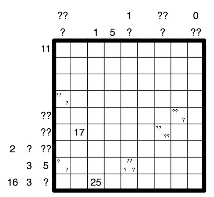 For all types of clues, a question mark can replace any number from 0 to 9, but no double digit clue may have a leading 0.
