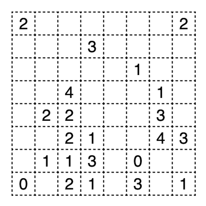 Draw a closed loop that travels along the edges of cells that does not touch or cross itself. Clues indicate how many times the loop visits the respective cells. In this context, a “visit” is defined as a contiguous section of the loop traveling on the boundary of the cell, including the possibility of just a single corner point; two such sections are considered separate visits if the loop leaves the boundary of the cell between them.