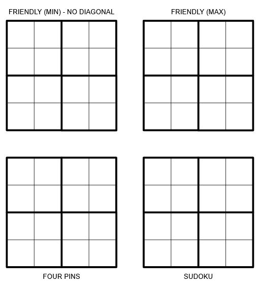Lösungscode: Row 4 from each grid in order (Friendly Min, Friendly Max, Four Pins, Sudoku)