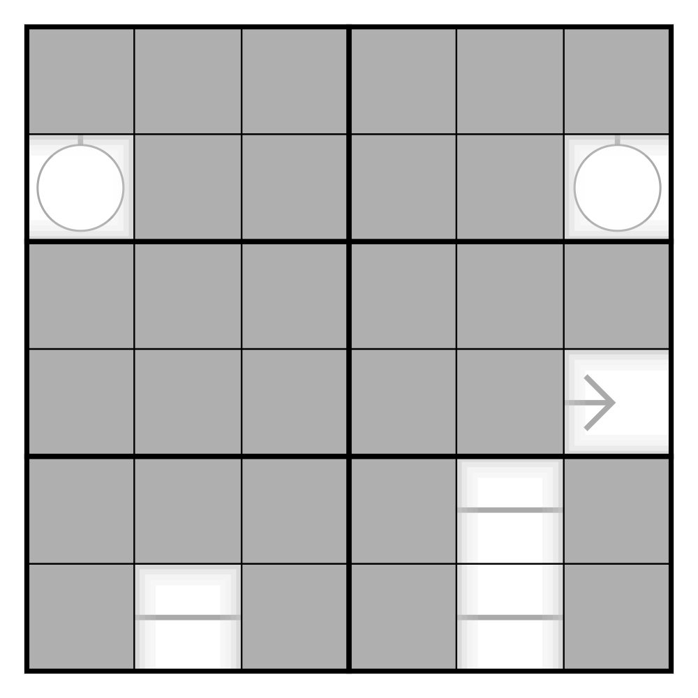 D.I.Y. FOG - Add fog to half of the cells in each row, column, and box by shading them medium grey. Sections of arrow clues under the fog are gone, and can be ignored. The real shape of arrow clues under the fog must be determined by the solver (but must be consistent with arrow clue sections that are still visible). Arrows only move orthogonally, and can't move into cells already occupied by another arrow.