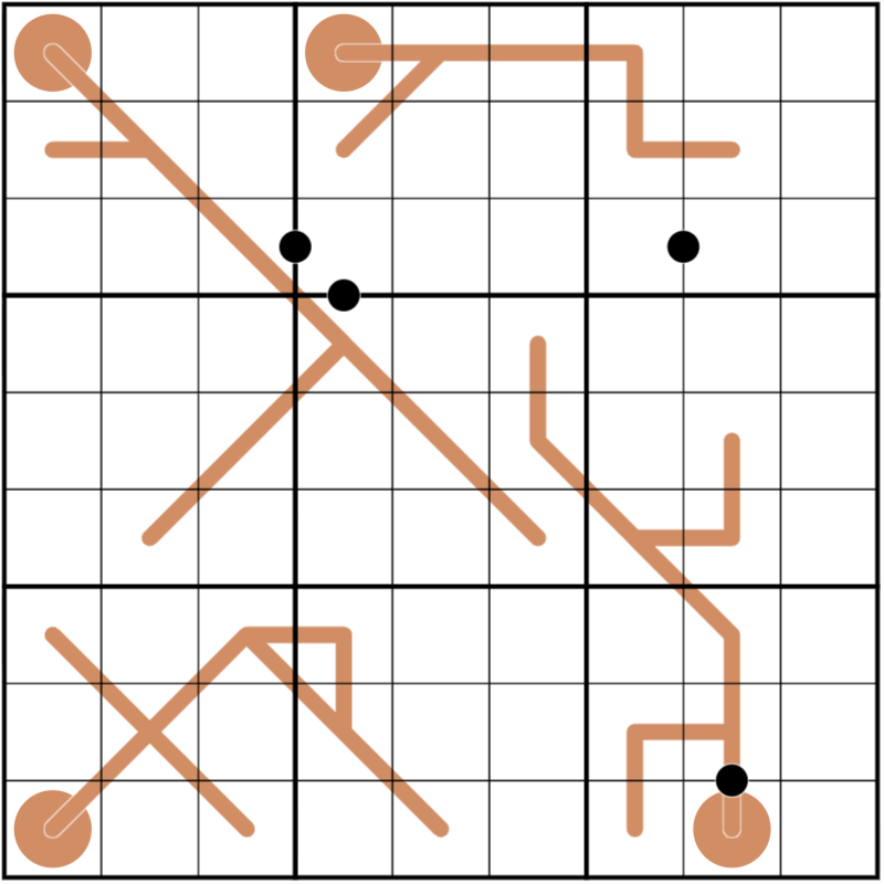 region sum lines. Numbers on a slow thermometer increase or stay the same as they move away from the bulb. For each region sum line, digits on the line have an equal sum N within each box it passes through.