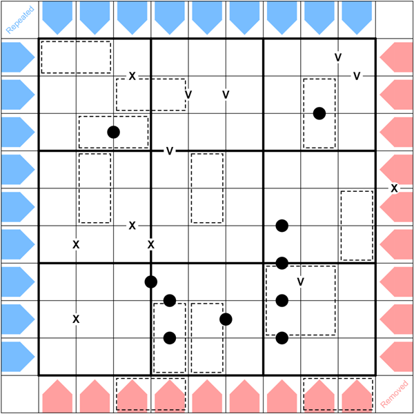 Kropki dots: A black dot between cells indicates cell values with a 2:1 ratio. Not all dots are shown.