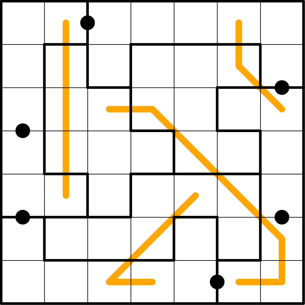 - Adjacent digits along an orange line must differ by at least 4.