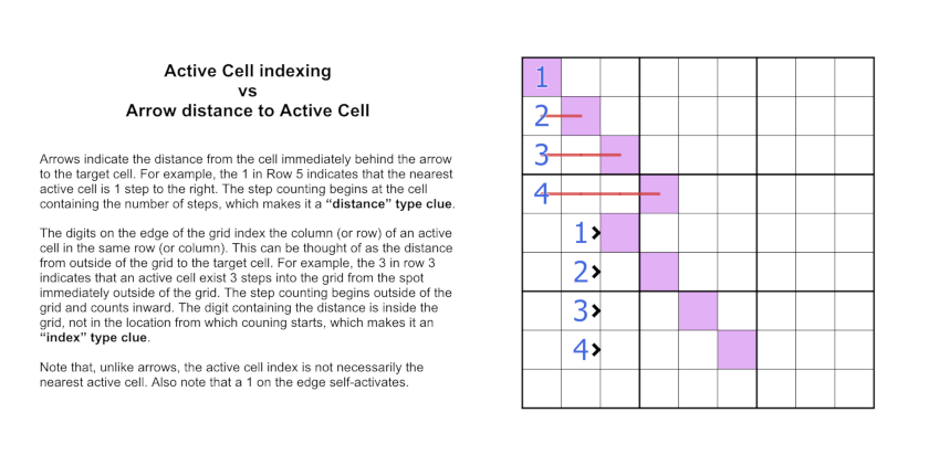 Like someone else said, I'd love an example on the "N cells from the edge" rule. Because a 1 on an arrow indicates the adjacent cell, but a 1 on the edge activates the cell it occupies. And that's slightly confusing at first reading of the rules.