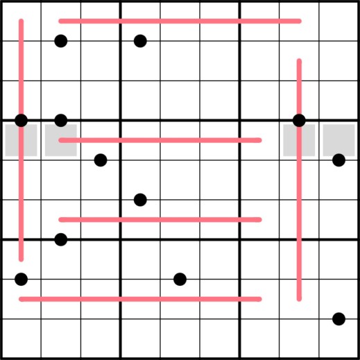 Normal Sudoku rules apply. DUTCH WHISPERS- Numbers on red lines are at least 4 apart from their neighbors on the line. KROPKI PAIRS- Numbers with a black dot between them are in a ratio of 2:1. Not all possible dots are given. EVEN- Numbers in cells with a gray square are even.