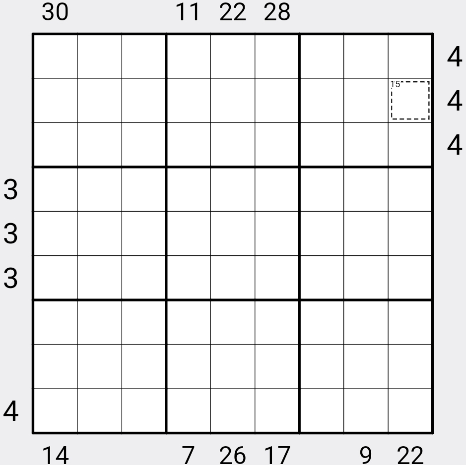 2. Clues above and below the grid are y-sums. Where X is the closest digit to the clue, and places "Y" in the Xth posistion of its respective column. Y indicates that the first Y cells from the clue, will sum to the clue in its respective column. For example, a 10 clue could mean 3142, 372, 73 and 2 in the 7th position, etc.