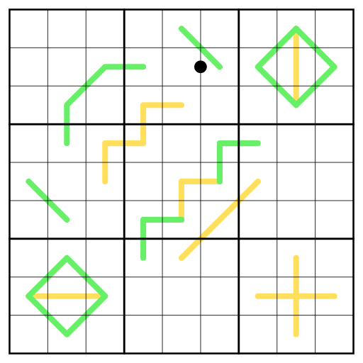 - Nabner Lines: The yellow lines are Nabner Lines, i.e. on such a line there may not be consecutive or repeated digits. For example, if a 5 lies on a Nabner line, this line may not contain another 5 and neither a 4 nor a 6.