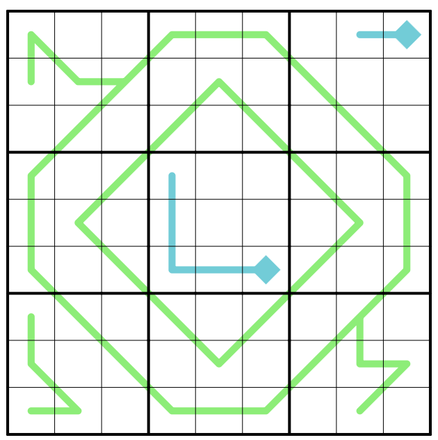 The Nth digit along a teal line (starting from the diamond) indicates the position along the line where the digit N appears. Eg: if the first cell along a line is a 3, then the 3rd cell along that line is a 1.