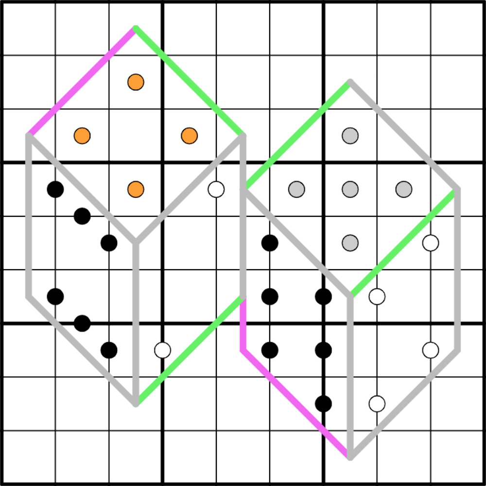 White pips separate consecutive digits (white Kropki dot).