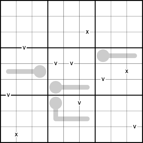- Cells connected by an X must sum to 10. Cells connected by a V must sum to 5. Not all Xs and Vs are given.