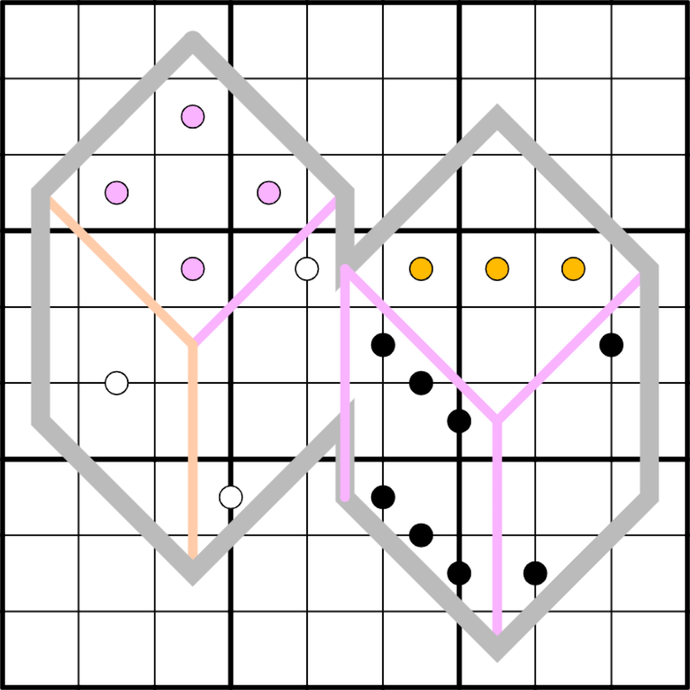 - Entlang der Pfirsichlinie muss jeder Satz von drei aufeinanderfolgenden Zellen eine niedrige {1,2,3}, mittlere {4,5,6} und hohe {7,8,9} Ziffer enthalten (entropische Linie).