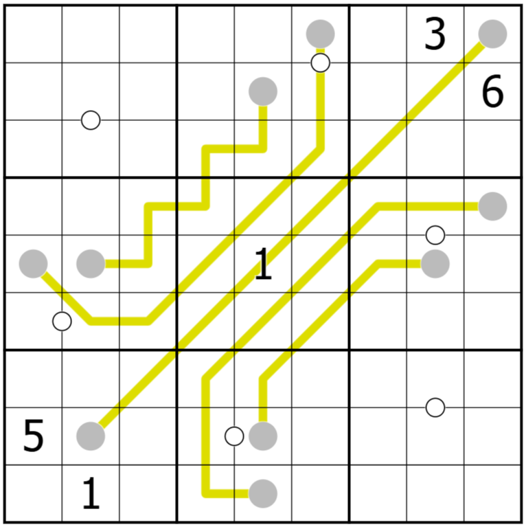 - Equivalence lines: On a yellow line, the digits on the ends (in circles) must be the same digit N. Furthermore, every digit between the circles must have the same remainder when divided by N. For example, if N=2, the digits between the circles are either all odd or all even.